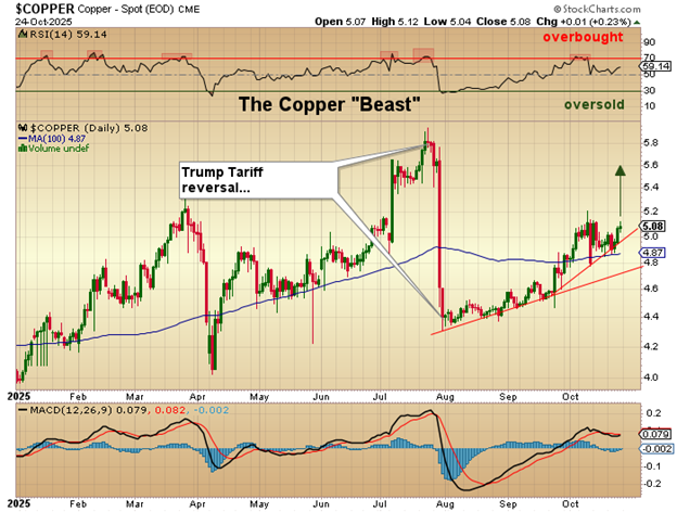 Copper has been relegated to the darkened cloakroom of investor disinterest since August 27, when Jerome Powell "hinted" at a Fed rate cut. It has been overpowered by gold and silver, where majors like Agnico Eagle Mines Ltd. (AEM:TSX; AEM:NYSE) are ahead 112% YTD, which is unheard of for a blue-chip miner. Compare that to Wall Street darling Nvidia Corp. (NVDA:NASDAQ)up 34.93% YTD. In the absence of any real bullish narrative, copper has surpassed $5.00/pound, which was once considered impossible without the tariffs. Now we have three major copper mines either impaired or disabled (Grasberg, El Cobre, and Kakoa-Kakula), and few people care, just as was the case for uranium in 2018 and the precious metals in 2023. Copper is my number one selection in the metals universe and has been for a long time, with the exception of the June-July spike to $6.00 when I stepped aside in favor of silver and gold. Now, as a trader, I have earned the right to reverse back to copper as the first place to invest capital in 2025-2026.