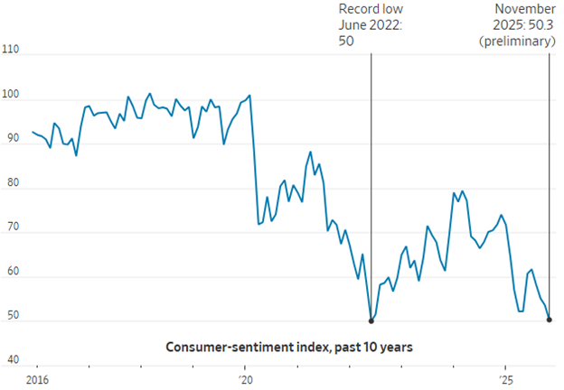 The University of Michigan report on consumer sentiment reflects the least amount of optimism since mid-2022, when inflation was running at 9%. Here we are three years later, and sentiment is once again in the tank with inflation running at somewhere around 3%. It seems that the rapidly approaching tsunami of job replacement by the AI robots has consumers terrified about future employment (or lack thereof). Of course, the survey could not have had many stock market investors polled, as sentiment for stocks has never been higher. Margin debt is through the roof, and dip-buyers prevail everywhere, such as Friday afternoon, when a 75-point plunge in the S&P turned into an 8.48-point gain in the very last hour.