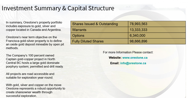 Orestone Mining Corp. (ORS:TSX.V; 02R2:FSE) is entering a new phase of growth with a refreshed portfolio and a strategy built around two complementary gold assets: the newly acquired Francisca oxide gold system in Salta, Argentina, and the long-established Captain gold-copper porphyry project in British Columbia. Together, they give the company something rare in the junior sector: the ability to operate, explore, and generate news year-round in two mining-friendly jurisdictions.