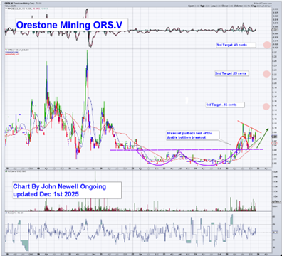 The technical setup supports the fundamental story: a completed double bottom, a successful breakout retest, rising volume, and a series of higher lows. At the December 1, 2025, closing price of CA$0.09, the shares present an attractive speculative entry point with clear upside targets, and is a Speculative Buy.