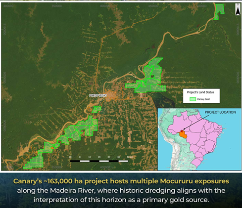 Canary Gold is a Canadian-listed exploration company focused on advancing the Rio Madeira Gold Project in Rondônia, Brazil. The company controls roughly 163,000 hectares along the Madeira River system, one of South America's richest historic placer belts, where more than 7 million ounces of gold were dredged from the river between the 1970s and 1990s.