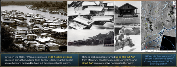 The Rio Madeira has already proven its fertility. At the peak of the dredging rush, more than 1,400 floating dredges worked the river, pulling millions of ounces from the riverbed. NASA radar imagery and local geophysics now highlight abandoned paleochannels that cross Canary's licences, guiding where the Mocururu horizon may be thickened and enriched. - Multi-year groundwork and a major drill program