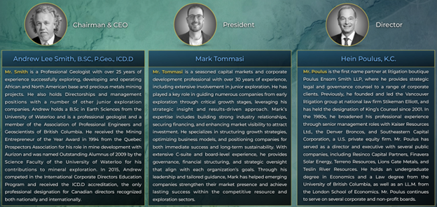 - Andrew Lee Smith, P.Geo. – CEO, Executive Chairman & Director