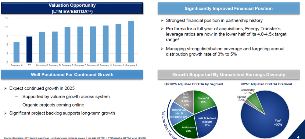 As a recap for those who don't already own shares or know the company, their operations focus on moving and storing natural gas, natural gas liquids (NGLs), crude oil, and refined products through an integrated network of pipelines, terminals, storage facilities, and processing plants. Energy Transfer provides core midstream services such as gathering, compression, fractionation, processing, and bulk transportation to support production and downstream supply.