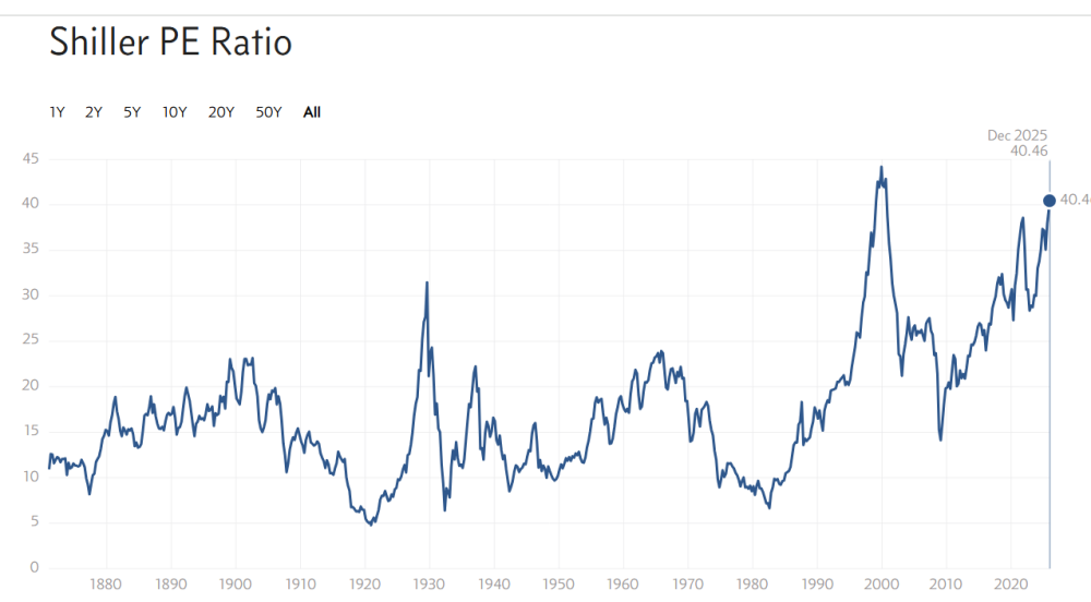 The S&P500 PE ratio has gone higher since my last update on this. This is a new record for a pre-crash level. Remember that when a bubble bursts, the stocks fall quicker than the earnings at first and set a higher PE. The last peak around 2000 was the dot-com bust. Once this AI bubble pops, we will probably set a record high with the PE of over 60.